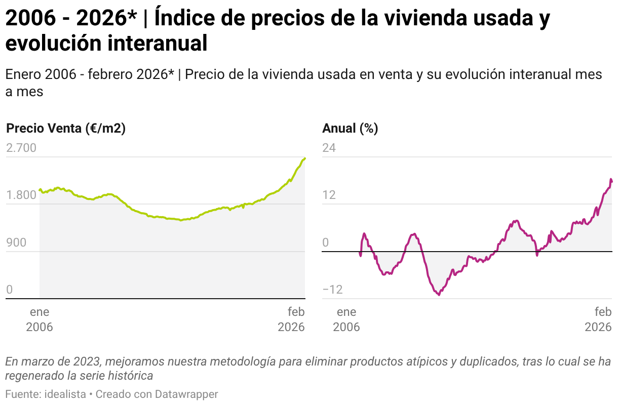 Enero 2006 - febrero 2026* | Precio de la vivienda usada en venta y su evolución interanual mes a mes
